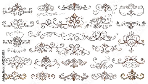 A collection of ornate decorative elements, featuring various swirls, scrolls, and floral designs in shades of brown and gold, ideal for graphic design projects.