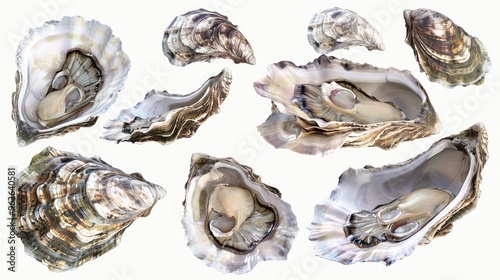 A collection of oyster shells with one of them being cracked open. The shells are of various sizes and shapes, with some being larger and others smaller. Concept of fragility and delicacy