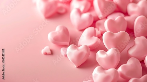A collection of pink heart-shaped candies scattered on a soft pink surface, evoking feelings of love and affection.