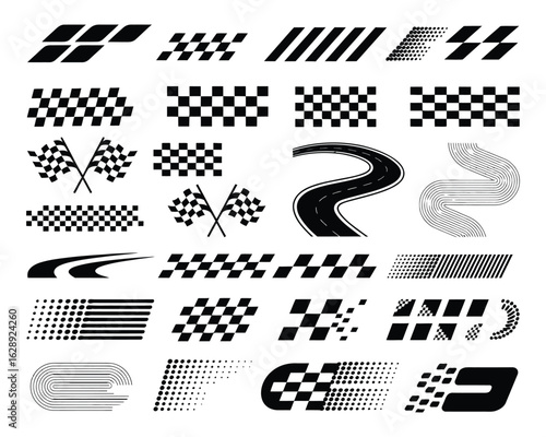 A collection of racing-themed design elements, including checkered patterns, finish flags, road shapes, and speed motion effects.