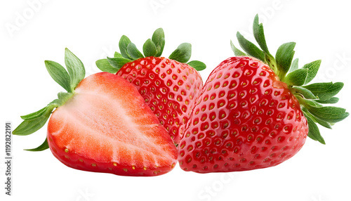A collection of ripe, bright red strawberries showcased with juicy texture and green tops, including a halved strawberry revealing its vivid interior, set against a white background