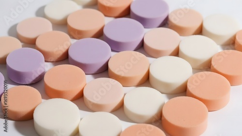 A collection of round makeup sponges in pastel shades of purple, peach, and white, arranged in a circular pattern on a white background, isolated on white background