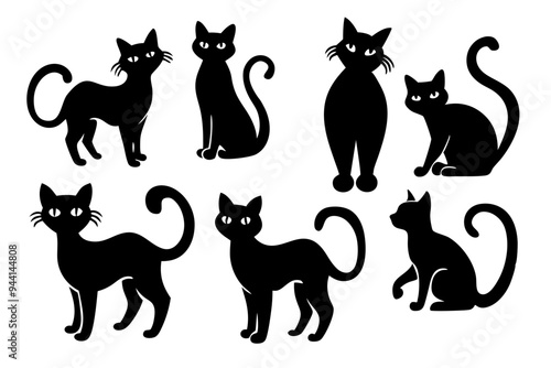 A collection of seven playful, stylized black cats in various poses, featuring distinct shapes and expressions