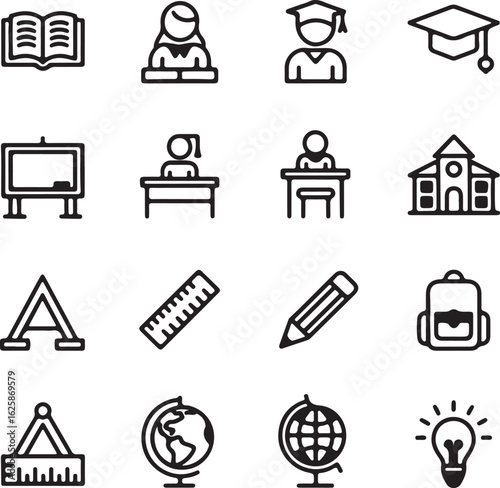 A collection of simple black and white line art icons representing education and learning including books students graduation caps and school buildings perfect for educational websites and presentatio