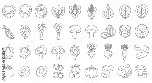 A collection of simple black-and-white line art icons of vegetables and fruits