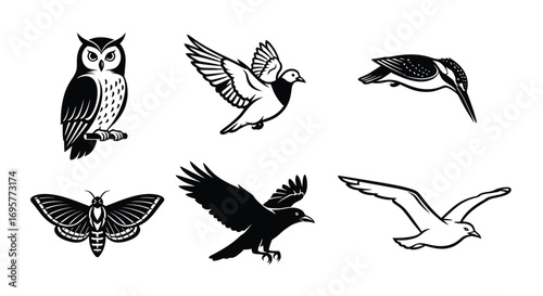 A collection of six black and white graphic illustrations of various birds and a moth on a white background.