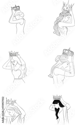 A collection of six minimalist line art drawings of different women placing crowns on their heads.