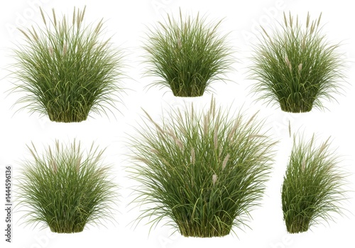 A collection of six tufts of green grass with white plumes isolated on a white background in a studio shot