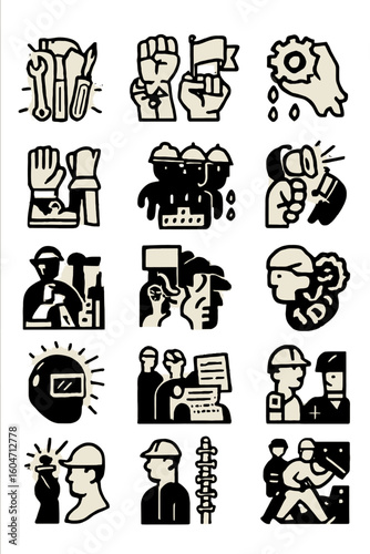 A collection of sixteen unique black and beige illustrations depicting various workers and tools, ideal for construction, industrial, and labor-themed projects, offering a versatile set of icons for