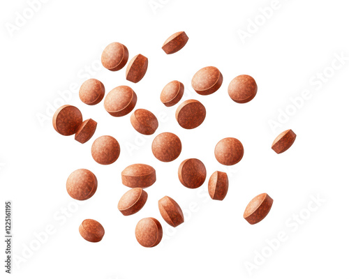 A collection of small, round, reddish-brown tablets scattered on a surface.
