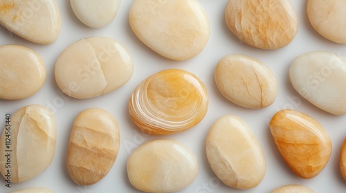 A collection of smooth, polished stones in soft beige and cream tones, arranged closely together on a light background.