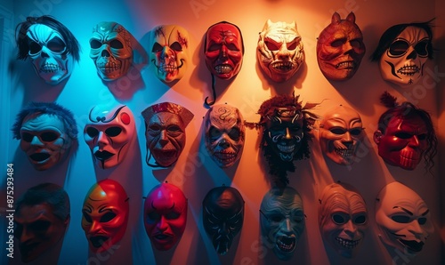A collection of spooky Halloween masks hanging on a wall with eerie lighting, leaving space in the center for copy