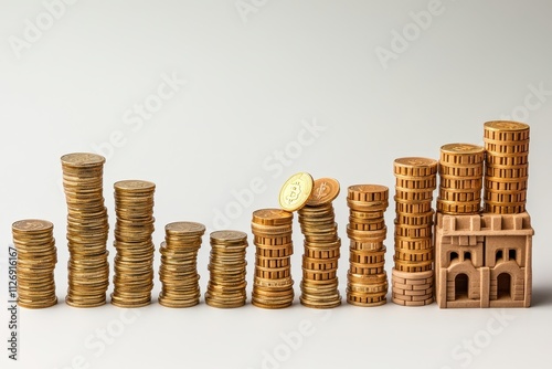 A collection of stacked coins and a miniature building, illustrating growth and investment in finance.
