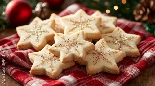 A collection of star-shaped cookies decorated with colorful sprinkles rests on a red and white plaid cloth. Holiday ornaments nearby create a warm, festive atmosphere perfect for celebrations.