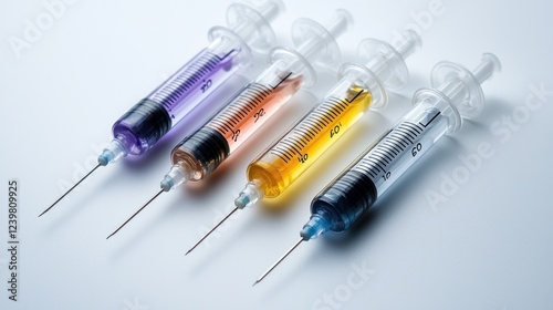 A collection of syringes filled with colorful liquids for medical or laboratory use.