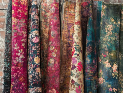 A collection of tapestry fabrics with intricate patterns and textures arranged in a layered display