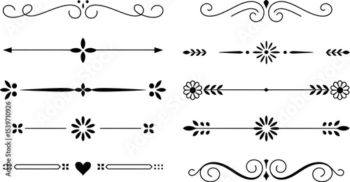A collection of ten unique black and white decorative divider line elements on a white background