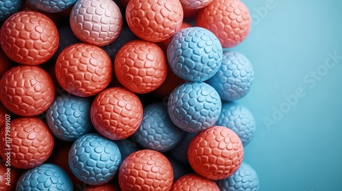 A collection of textured spheres in coral and turquoise hues arranged against a vibrant teal backdrop.
