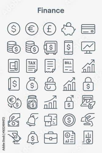 A collection of thin line art icons representing various financial concepts like currency, banking, and investment.
