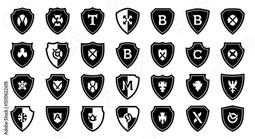 A collection of thirty decorative heraldic shield icons with various symbols, letters, and designs in a simple black and white style.