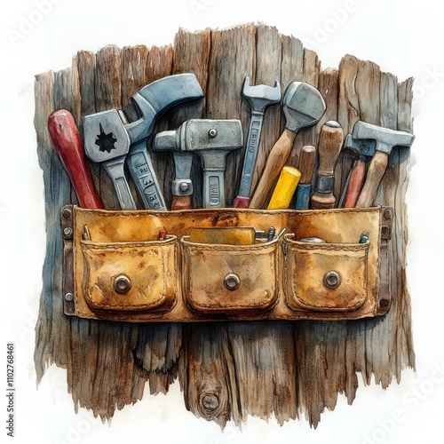 A collection of tools in a leather pouch hanging on a wooden surface.