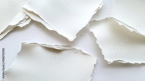 A collection of torn, textured white paper pieces arranged on a flat surface.
