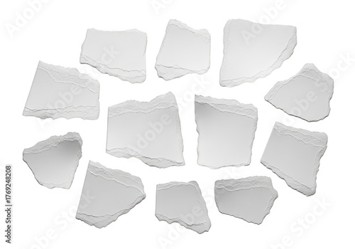 A collection of torn white paper pieces arranged on a black background in a circular pattern form