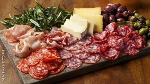 A collection of traditional Italian antipasti, including cured meats, cheeses, and olives.