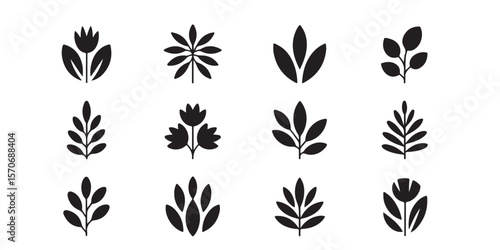 A collection of twelve black and white leaf and flower icons arranged in a grid pattern
