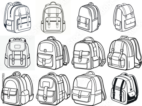 A Collection of Twelve Diverse Backpack vector illustration Designs Illustrated in Black and White