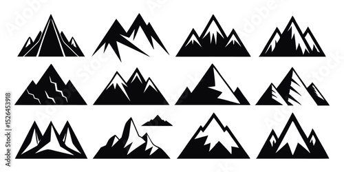 A collection of twelve mountain icons featuring diverse shapes and styles