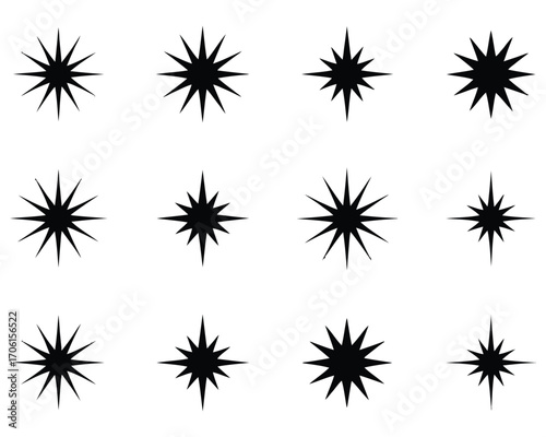 A collection of twelve unique black starburst and sparkle vector icons. Set of various star-like symbols in silhouette, isolated on a white background