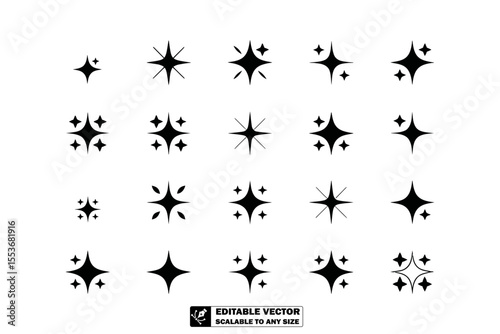 A collection of twenty five different black star icons arranged on a light background in a grid pattern