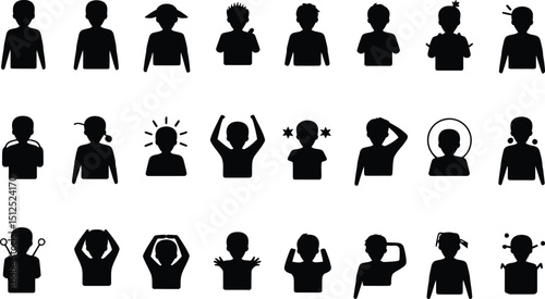 A collection of twenty one black silhouette icons representing different people and their emotions