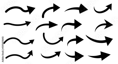 A collection of twenty-one black arrow illustrations with curved shafts pointing right, arranged in rows on a white background.