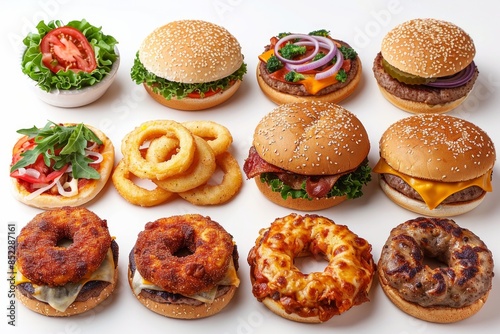 A collection of various fast food items including burgers, fries, onion rings, and pizza slices, isolated on white background American takeout food
