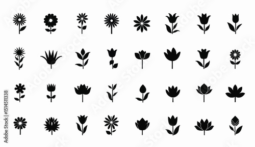 A Collection of Various Flower Silhouette Icons Isolated on White Background for Design.