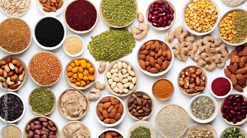 A Collection Of Various Grains Nuts And Seeds In Bowls