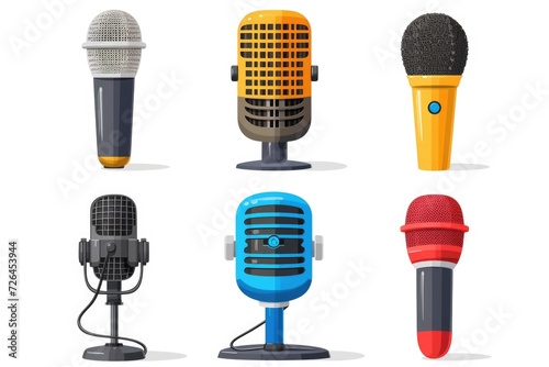 A collection of various microphones placed on a clean white background. Ideal for use in music production, podcasting, broadcasting, and sound recording projects