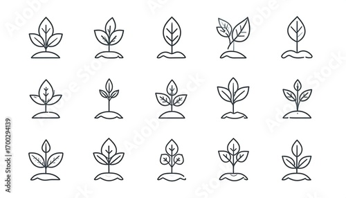 A collection of various plant sprout illustrations, depicted in a simple line art style.