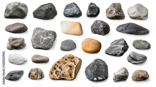 A collection of various rocks, stones, and pebbles of different colors and textures on a white background. AI.