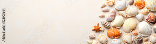 A collection of various seashells and a starfish are artistically arranged against a neutral background, showcasing natural ocean beauty and diversity.
