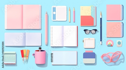 A collection of various stationery items including highlighters notebooks and sticky notes neatly arranged on a clean white background suitable for workspace or educational concepts