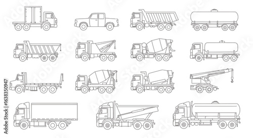 A collection of various truck illustrations in a vector format, ideal for transportation and industrial design projects, presented as a detailed PNG image for versatile use.
