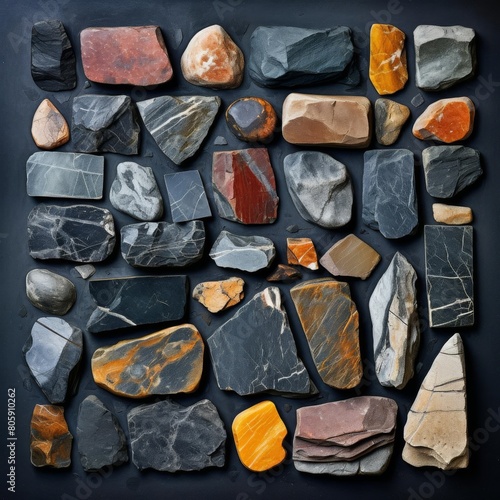 A collection of various types of rocks and stones in different colors and textures arranged on a black background.