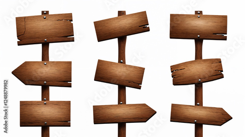 A collection of various wooden signboards with different shapes and designs, including arrows, rectangular planks, and rustic aged wood signs.