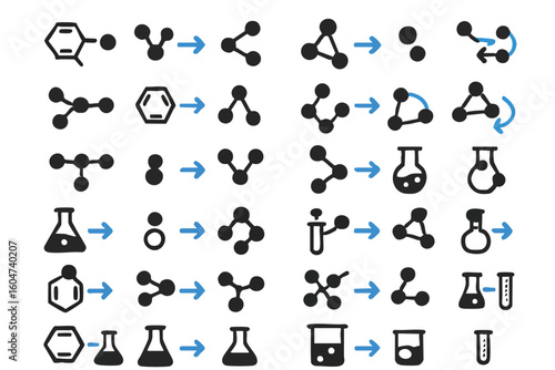 A collection of vector illustrations showcasing chemical reactions and molecular structures, ideal for educational and scientific content creation and design projects.