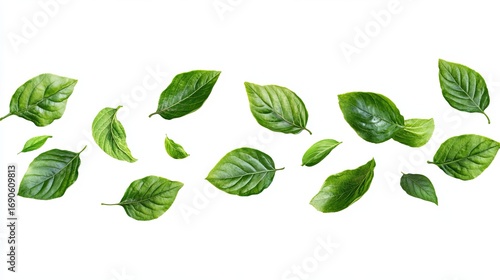 A collection of vibrant green leaves, scattered against a clean white backdrop, creating a lively and fresh visual