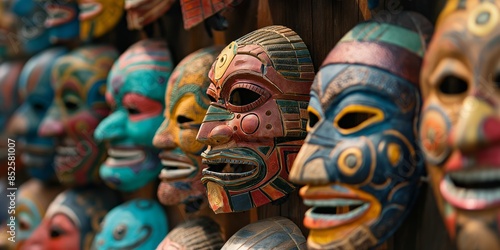 A collection of vibrant traditional masks displayed on a wooden wall with intricate designs