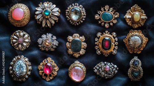 A collection of vintage brooches arranged neatly on a dark fabric background, highlighting their details.